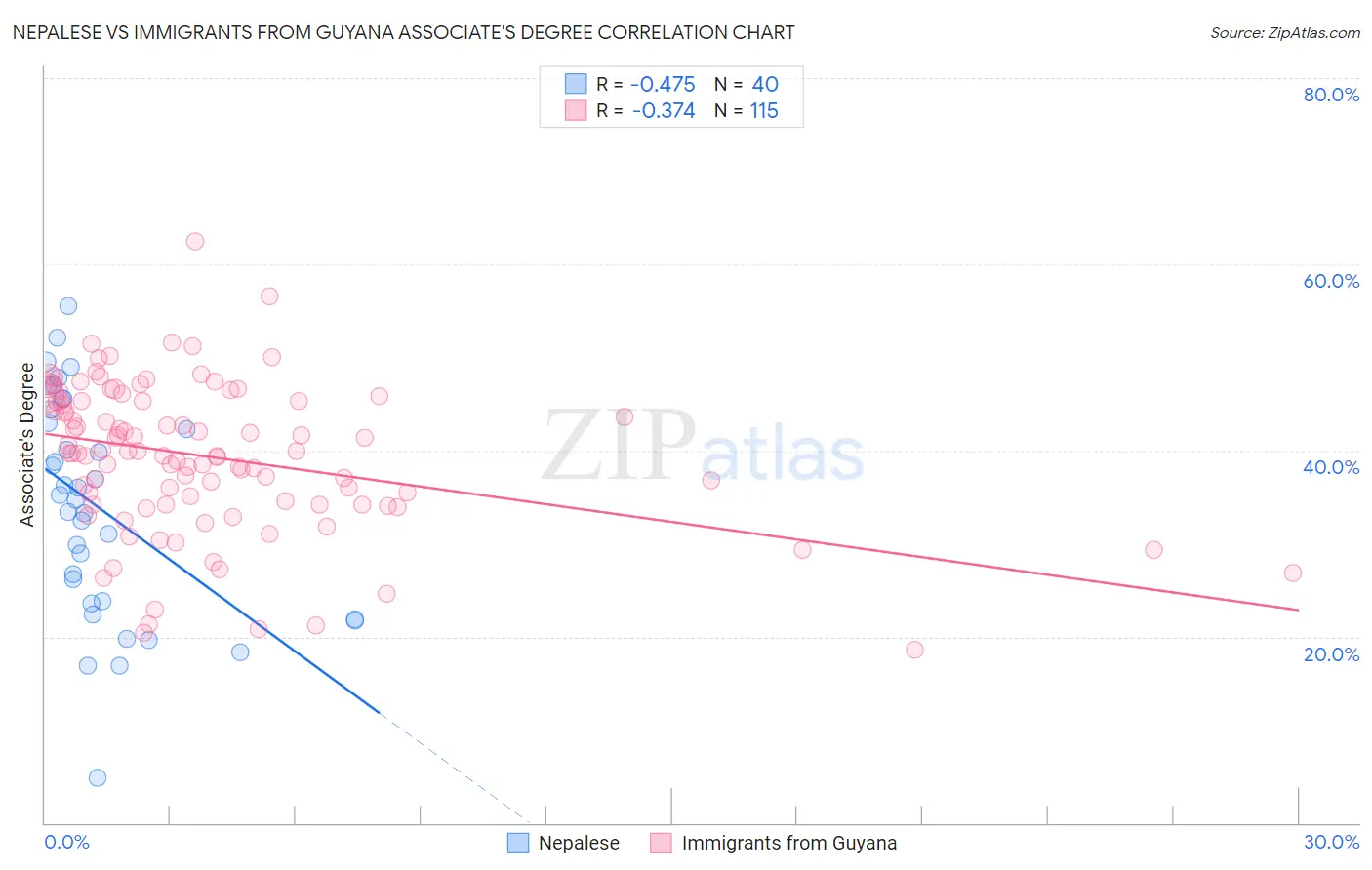 Nepalese vs Immigrants from Guyana Associate's Degree Correlation Chart