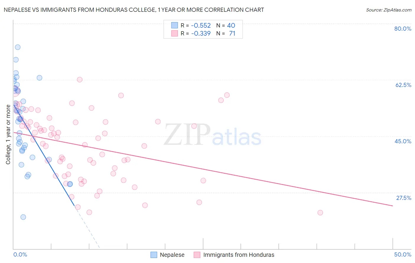 Nepalese vs Immigrants from Honduras College, 1 year or more Correlation Chart