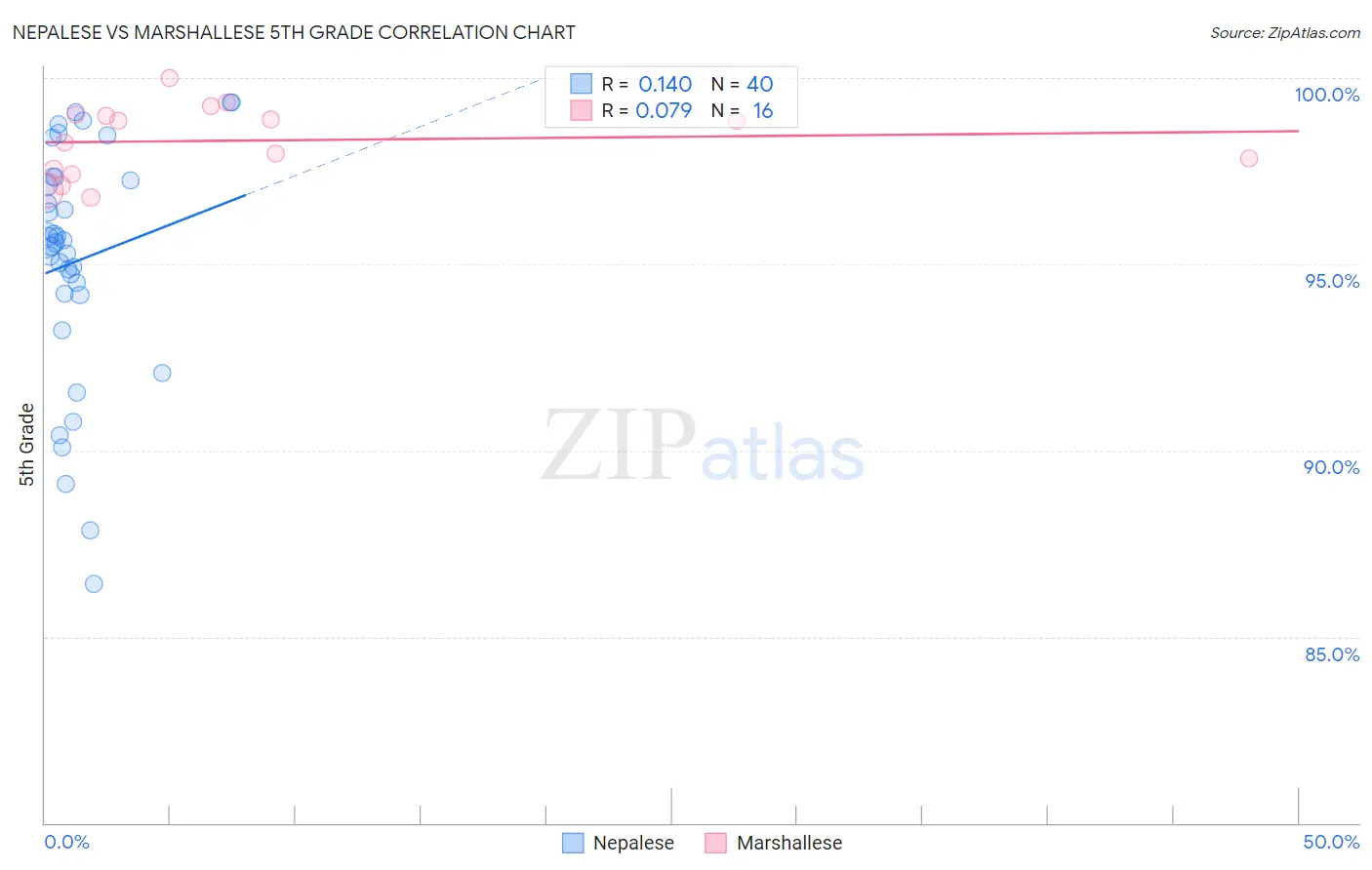 The statistical analysis conducted on geographies consisting of 24,521,755 people shows a poor positive correlation between the proportion of Nepalese and percentage of population with at least 5th grade education in the United States with a correlation coefficient (R) of 0.140 and weighted average of 95.2%. Similarly, the statistical analysis conducted on geographies consisting of 14,761,315 people shows a slight positive correlation between the proportion of Marshallese and percentage of population with at least 5th grade education in the United States with a correlation coefficient (R) of 0.079 and weighted average of 97.4%, a difference of 2.2%.