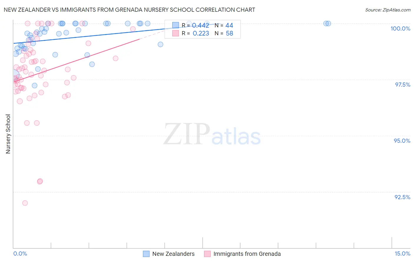 New Zealander vs Immigrants from Grenada Nursery School Correlation Chart
