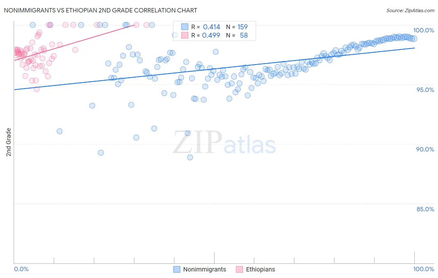 In terms of 2nd grade, the demographic groups most similar to Ethiopians are Immigrants from Indonesia (97.5%, a difference of 0.0%), Korean (97.5%, a difference of 0.010%), Asian (97.5%, a difference of 0.010%), Nigerian (97.6%, a difference of 0.020%), and U.S. Virgin Islander (97.6%, a difference of 0.020%).