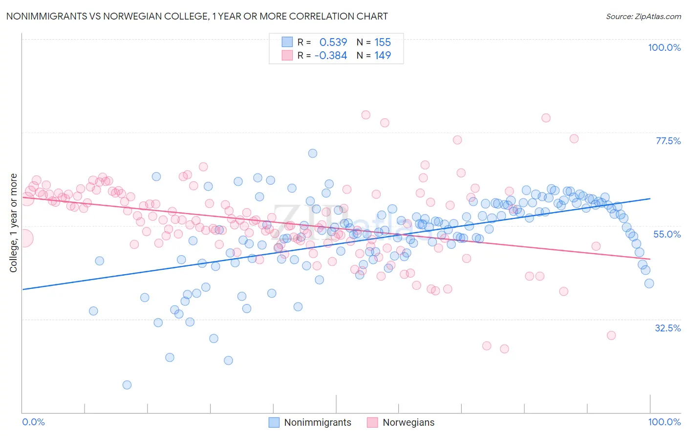 Nonimmigrants vs Norwegian College, 1 year or more Correlation Chart