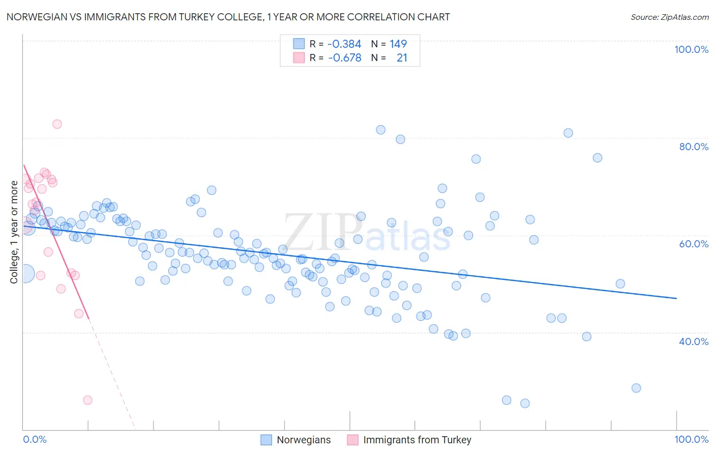 Norwegian vs Immigrants from Turkey College, 1 year or more Correlation Chart