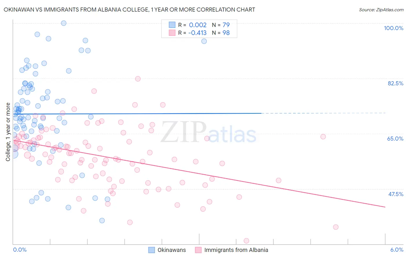 Okinawan vs Immigrants from Albania College, 1 year or more Correlation Chart