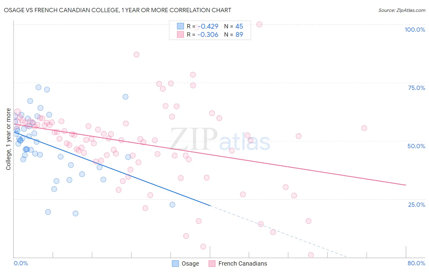 Osage vs French Canadian College, 1 year or more Correlation Chart