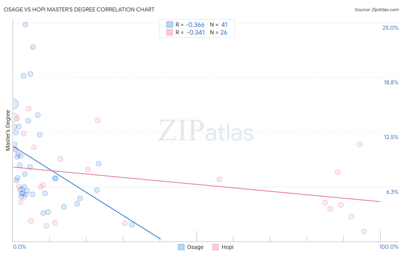 The statistical analysis conducted on geographies consisting of 91,790,824 people shows a mild negative correlation between the proportion of Osage and percentage of population with at least master's degree education in the United States with a correlation coefficient (R) of -0.366 and weighted average of 12.6%. Similarly, the statistical analysis conducted on geographies consisting of 74,729,525 people shows a mild negative correlation between the proportion of Hopi and percentage of population with at least master's degree education in the United States with a correlation coefficient (R) of -0.341 and weighted average of 10.9%, a difference of 15.6%.