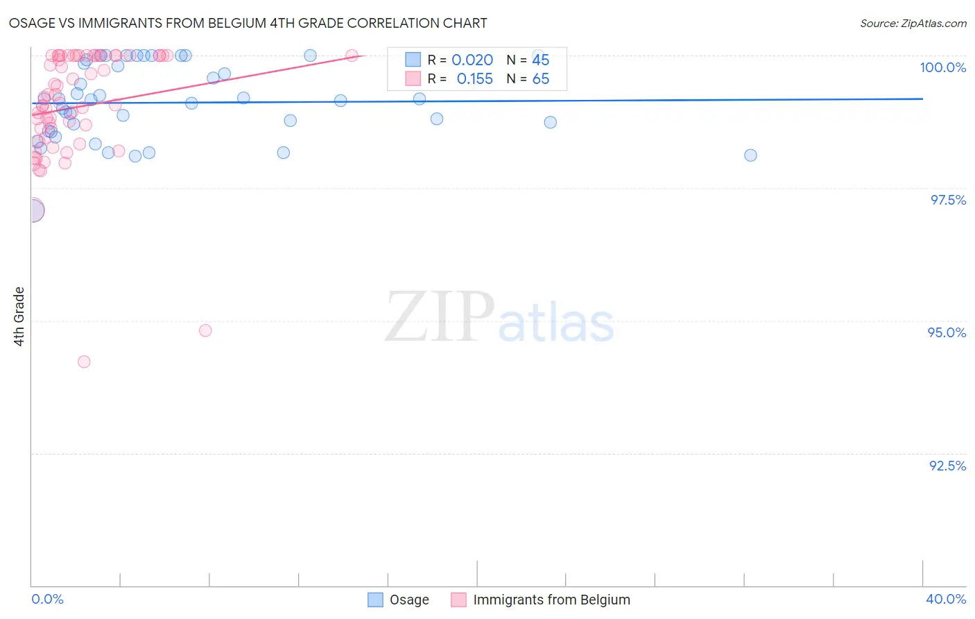 In terms of 4th grade, the demographic groups most similar to Osage are Ukrainian (98.0%, a difference of 0.0%), Immigrants from Netherlands (98.0%, a difference of 0.010%), Cherokee (98.0%, a difference of 0.010%), Immigrants from Lithuania (98.0%, a difference of 0.010%), and Immigrants from England (98.0%, a difference of 0.010%). Similarly, the demographic groups most similar to Immigrants from Belgium are Icelander (98.0%, a difference of 0.010%), Cypriot (97.9%, a difference of 0.010%), Potawatomi (97.9%, a difference of 0.010%), Immigrants from Australia (97.9%, a difference of 0.010%), and Ukrainian (98.0%, a difference of 0.020%).