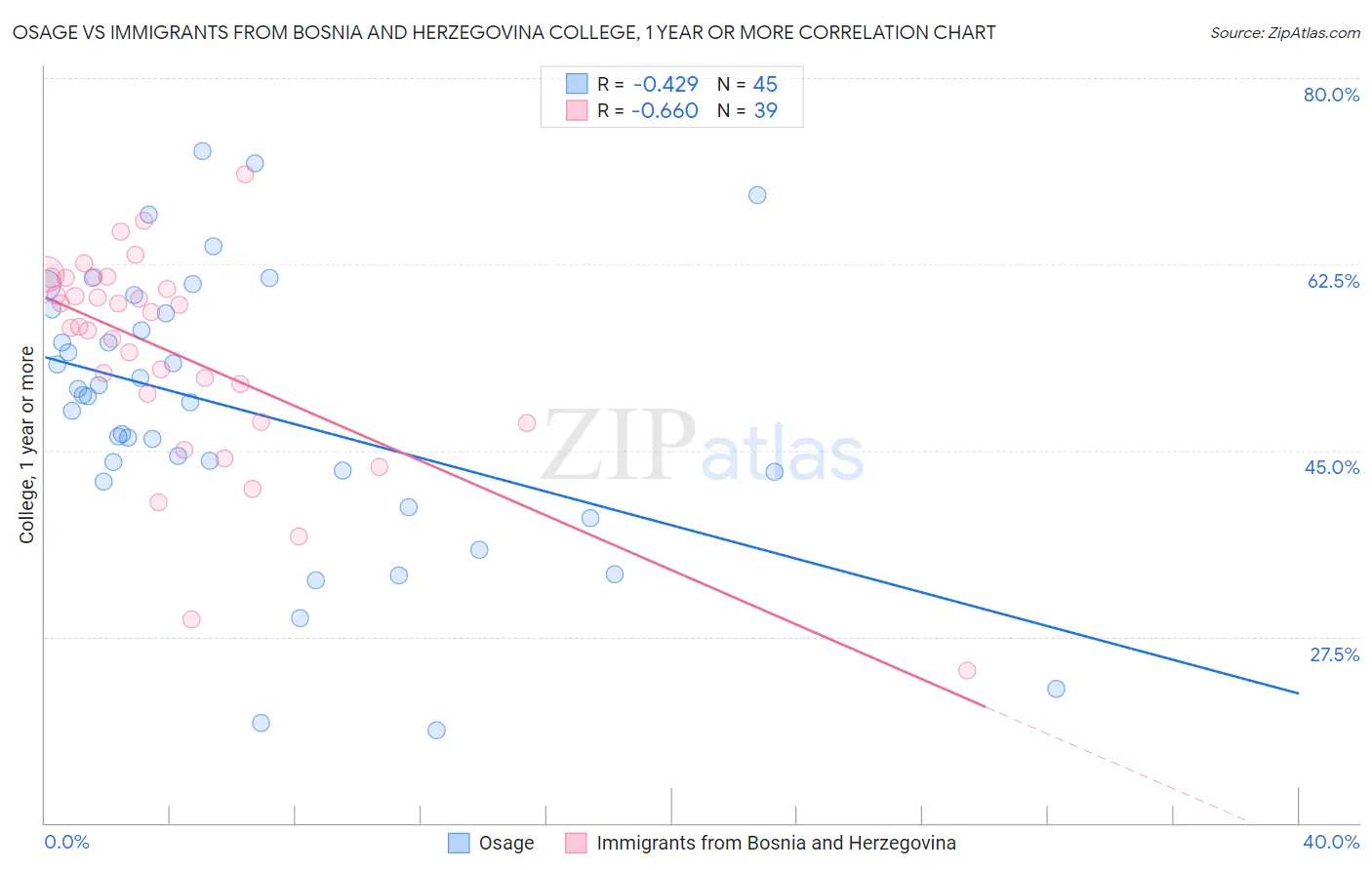 Osage vs Immigrants from Bosnia and Herzegovina College, 1 year or more Correlation Chart