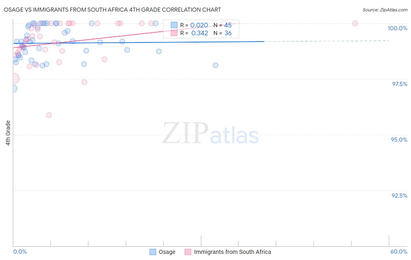 In terms of 4th grade, the demographic groups most similar to Osage are Ukrainian (98.0%, a difference of 0.0%), Immigrants from Netherlands (98.0%, a difference of 0.010%), Cherokee (98.0%, a difference of 0.010%), Immigrants from Lithuania (98.0%, a difference of 0.010%), and Immigrants from England (98.0%, a difference of 0.010%). Similarly, the demographic groups most similar to Immigrants from South Africa are Immigrants from Australia (97.9%, a difference of 0.0%), Zimbabwean (97.9%, a difference of 0.0%), Delaware (97.9%, a difference of 0.0%), Immigrants from Denmark (97.9%, a difference of 0.0%), and Immigrants from Sweden (97.9%, a difference of 0.0%).