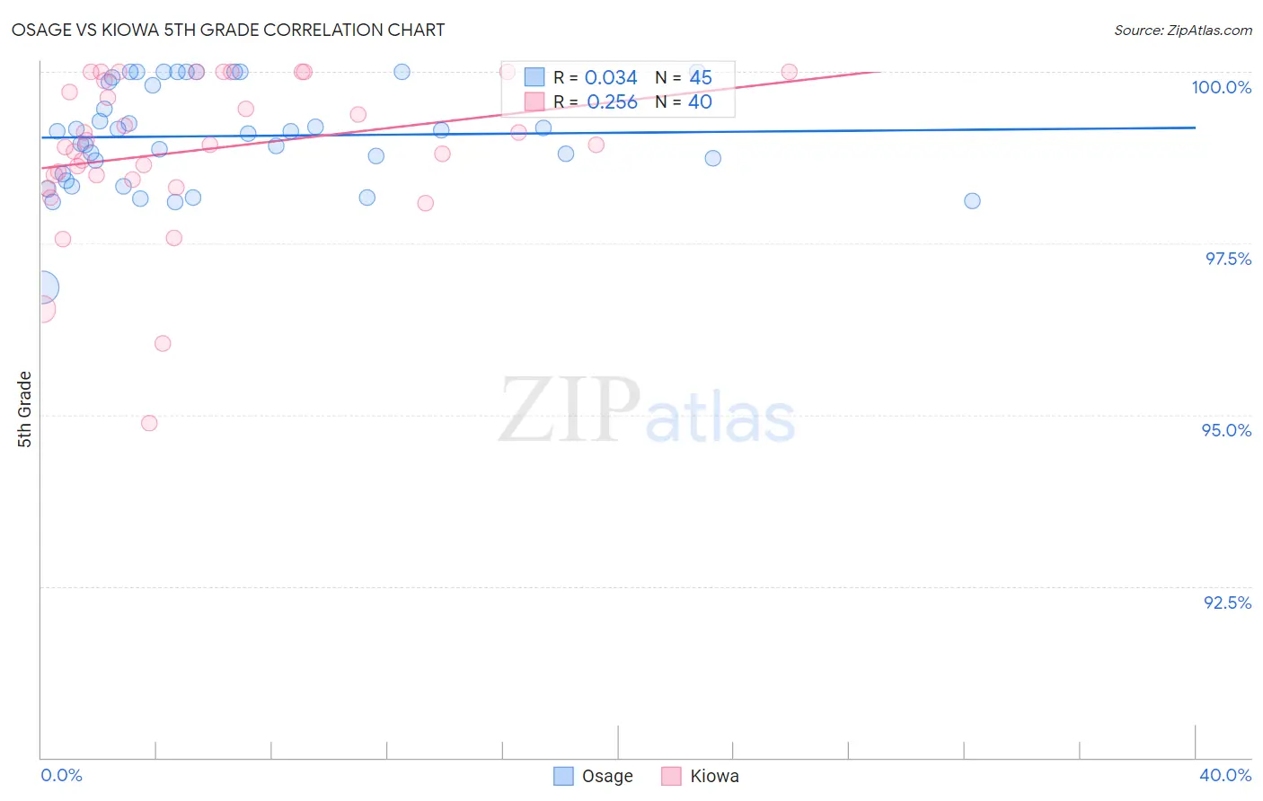 In terms of 5th grade, the demographic groups most similar to Osage are Lumbee (97.8%, a difference of 0.010%), Ukrainian (97.8%, a difference of 0.010%), Immigrants from Netherlands (97.8%, a difference of 0.010%), Immigrants from England (97.8%, a difference of 0.010%), and Immigrants from Lithuania (97.8%, a difference of 0.010%). Similarly, the demographic groups most similar to Kiowa are Cajun (97.9%, a difference of 0.010%), Iranian (97.9%, a difference of 0.010%), Chickasaw (97.9%, a difference of 0.010%), Immigrants from Austria (97.9%, a difference of 0.020%), and New Zealander (97.9%, a difference of 0.020%).