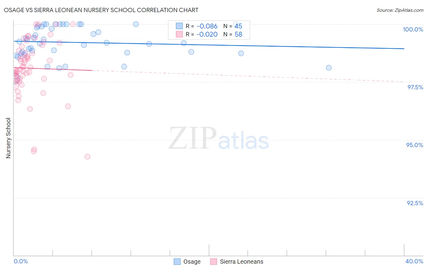 The statistical analysis conducted on geographies consisting of 91,808,929 people shows a slight negative correlation between the proportion of Osage and percentage of population with at least nursery school education in the United States with a correlation coefficient (R) of -0.086 and weighted average of 98.3%. Similarly, the statistical analysis conducted on geographies consisting of 83,337,655 people shows no correlation between the proportion of Sierra Leoneans and percentage of population with at least nursery school education in the United States with a correlation coefficient (R) of -0.020 and weighted average of 97.7%, a difference of 0.62%.