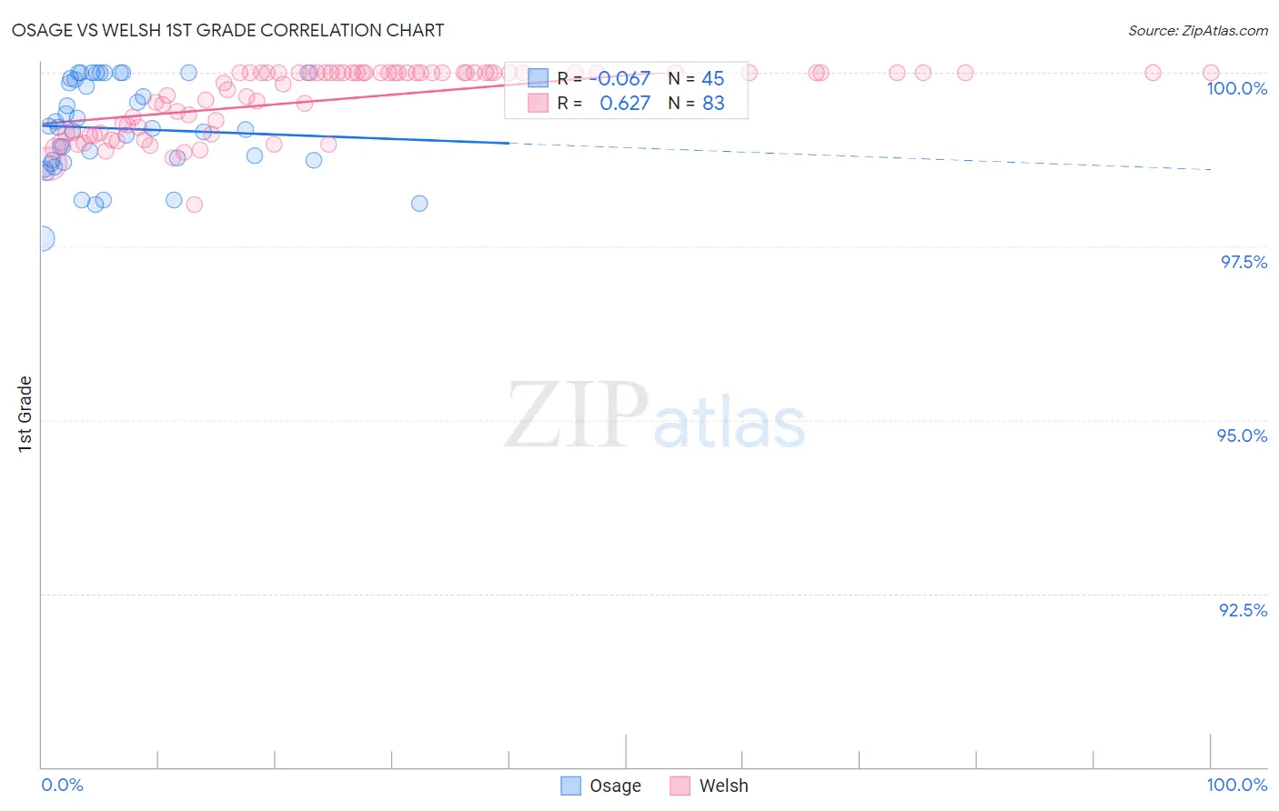 The statistical analysis conducted on geographies consisting of 91,808,929 people shows a slight negative correlation between the proportion of Osage and percentage of population with at least 1st grade education in the United States with a correlation coefficient (R) of -0.067 and weighted average of 98.3%. Similarly, the statistical analysis conducted on geographies consisting of 239,962,401 people shows a significant positive correlation between the proportion of Welsh and percentage of population with at least 1st grade education in the United States with a correlation coefficient (R) of 0.627 and weighted average of 98.9%, a difference of 0.58%.