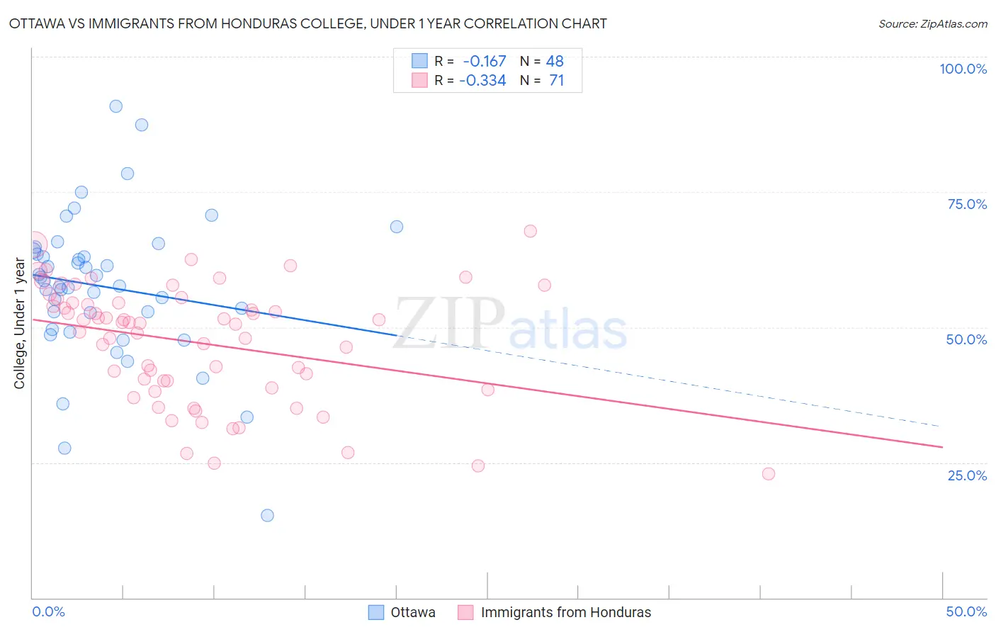 Ottawa vs Immigrants from Honduras College, Under 1 year Correlation Chart