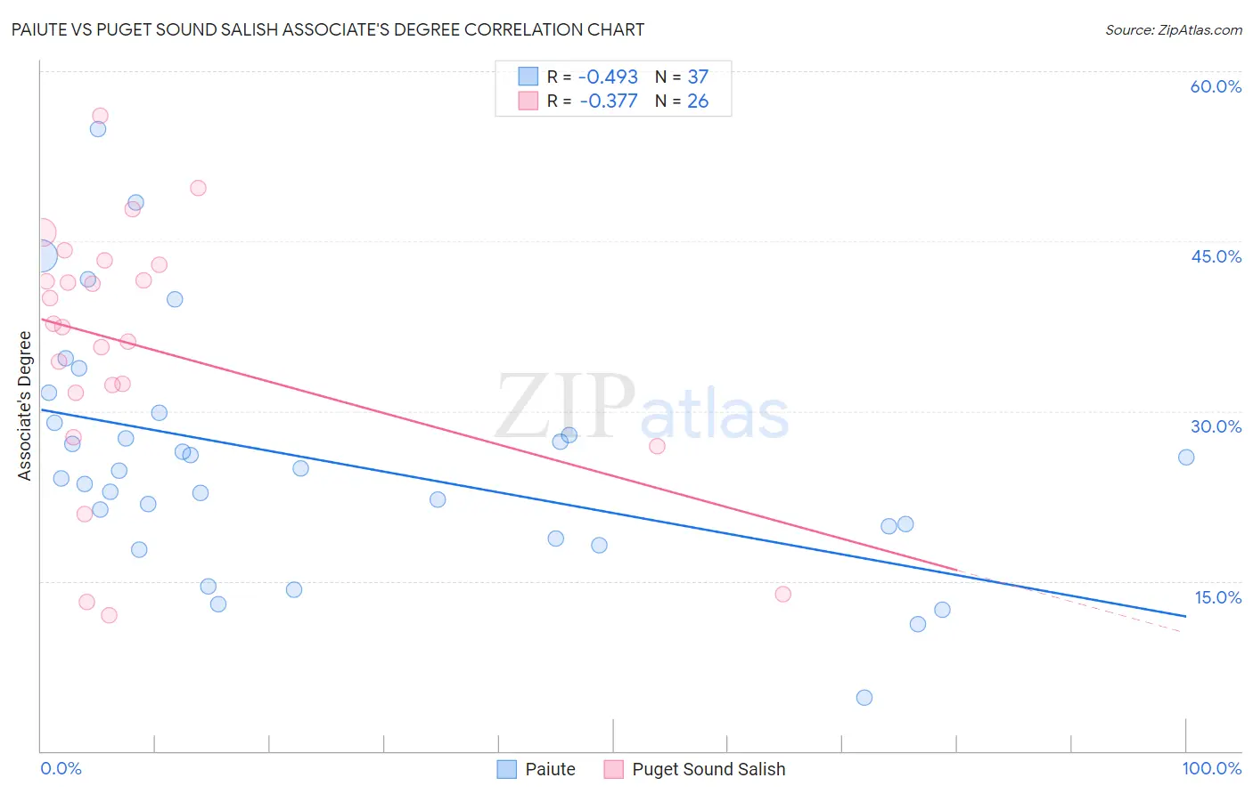 Paiute vs Puget Sound Salish Associate's Degree Correlation Chart
