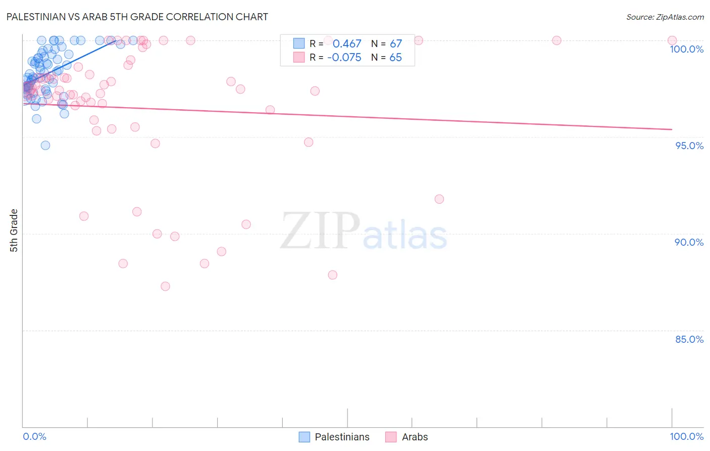 The statistical analysis conducted on geographies consisting of 216,424,519 people shows a moderate positive correlation between the proportion of Palestinians and percentage of population with at least 5th grade education in the United States with a correlation coefficient (R) of 0.467 and weighted average of 97.5%. Similarly, the statistical analysis conducted on geographies consisting of 486,871,007 people shows a slight negative correlation between the proportion of Arabs and percentage of population with at least 5th grade education in the United States with a correlation coefficient (R) of -0.075 and weighted average of 97.3%, a difference of 0.21%.
