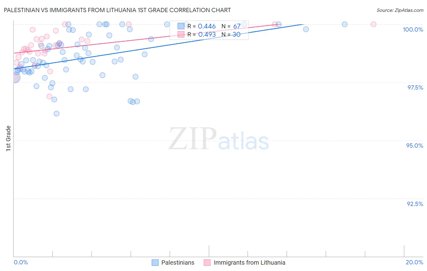 Palestinian vs Immigrants from Lithuania 1st Grade Correlation Chart