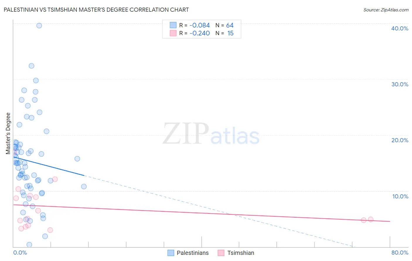 The statistical analysis conducted on geographies consisting of 216,432,261 people shows a slight negative correlation between the proportion of Palestinians and percentage of population with at least master's degree education in the United States with a correlation coefficient (R) of -0.084 and weighted average of 16.3%. Similarly, the statistical analysis conducted on geographies consisting of 15,626,544 people shows a weak negative correlation between the proportion of Tsimshian and percentage of population with at least master's degree education in the United States with a correlation coefficient (R) of -0.240 and weighted average of 11.4%, a difference of 43.0%.
