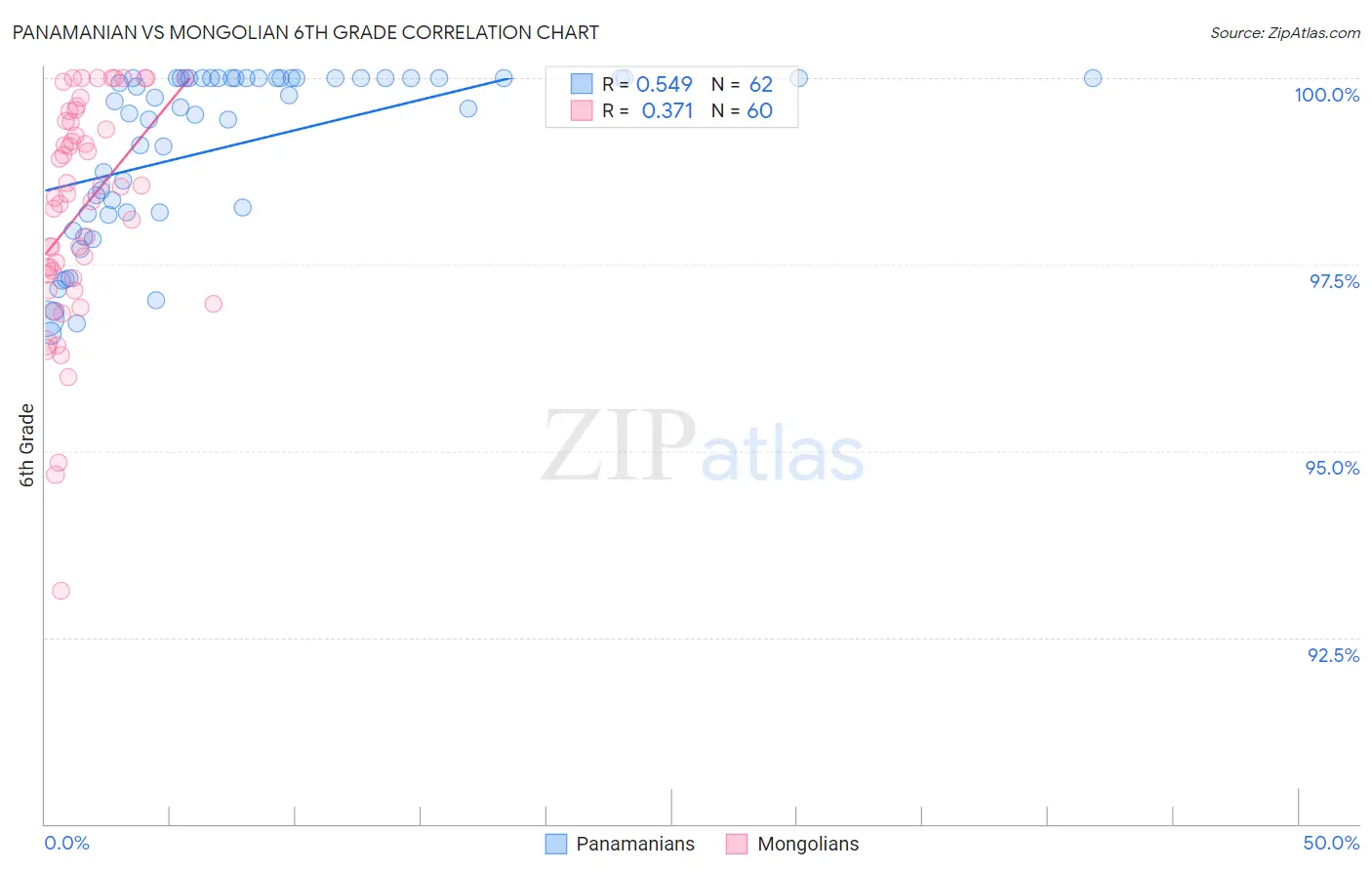 In terms of 6th grade, the demographic groups most similar to Panamanians are Hawaiian (96.9%, a difference of 0.0%), Paraguayan (96.9%, a difference of 0.0%), Dutch West Indian (96.9%, a difference of 0.010%), Immigrants from Lebanon (96.9%, a difference of 0.010%), and Immigrants from Egypt (97.0%, a difference of 0.020%). Similarly, the demographic groups most similar to Mongolians are Immigrants from Kazakhstan (97.0%, a difference of 0.0%), Immigrants from Micronesia (97.0%, a difference of 0.0%), Pakistani (97.0%, a difference of 0.0%), Venezuelan (97.0%, a difference of 0.010%), and Immigrants from Kenya (97.0%, a difference of 0.010%).