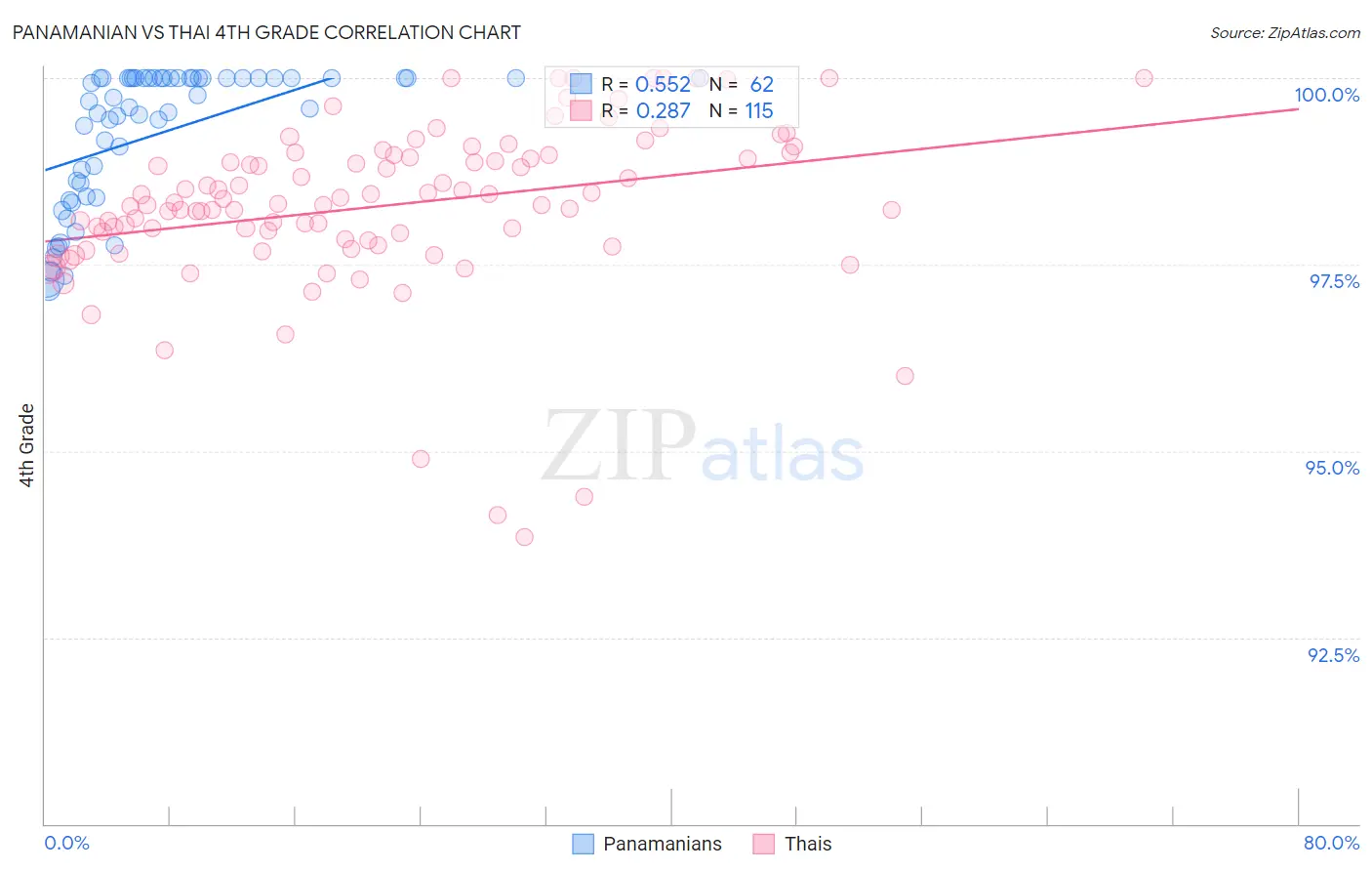The statistical analysis conducted on geographies consisting of 281,248,945 people shows a substantial positive correlation between the proportion of Panamanians and percentage of population with at least 4th grade education in the United States with a correlation coefficient (R) of 0.552 and weighted average of 97.4%. Similarly, the statistical analysis conducted on geographies consisting of 475,866,115 people shows a weak positive correlation between the proportion of Thais and percentage of population with at least 4th grade education in the United States with a correlation coefficient (R) of 0.287 and weighted average of 97.8%, a difference of 0.39%.