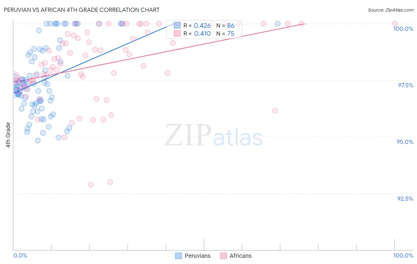 In terms of 4th grade, the demographic groups most similar to Africans are Immigrants from Northern Africa (97.4%, a difference of 0.0%), Immigrants from Southern Europe (97.4%, a difference of 0.010%), Immigrants from Chile (97.4%, a difference of 0.010%), Paiute (97.3%, a difference of 0.010%), and Immigrants from Zaire (97.3%, a difference of 0.010%).