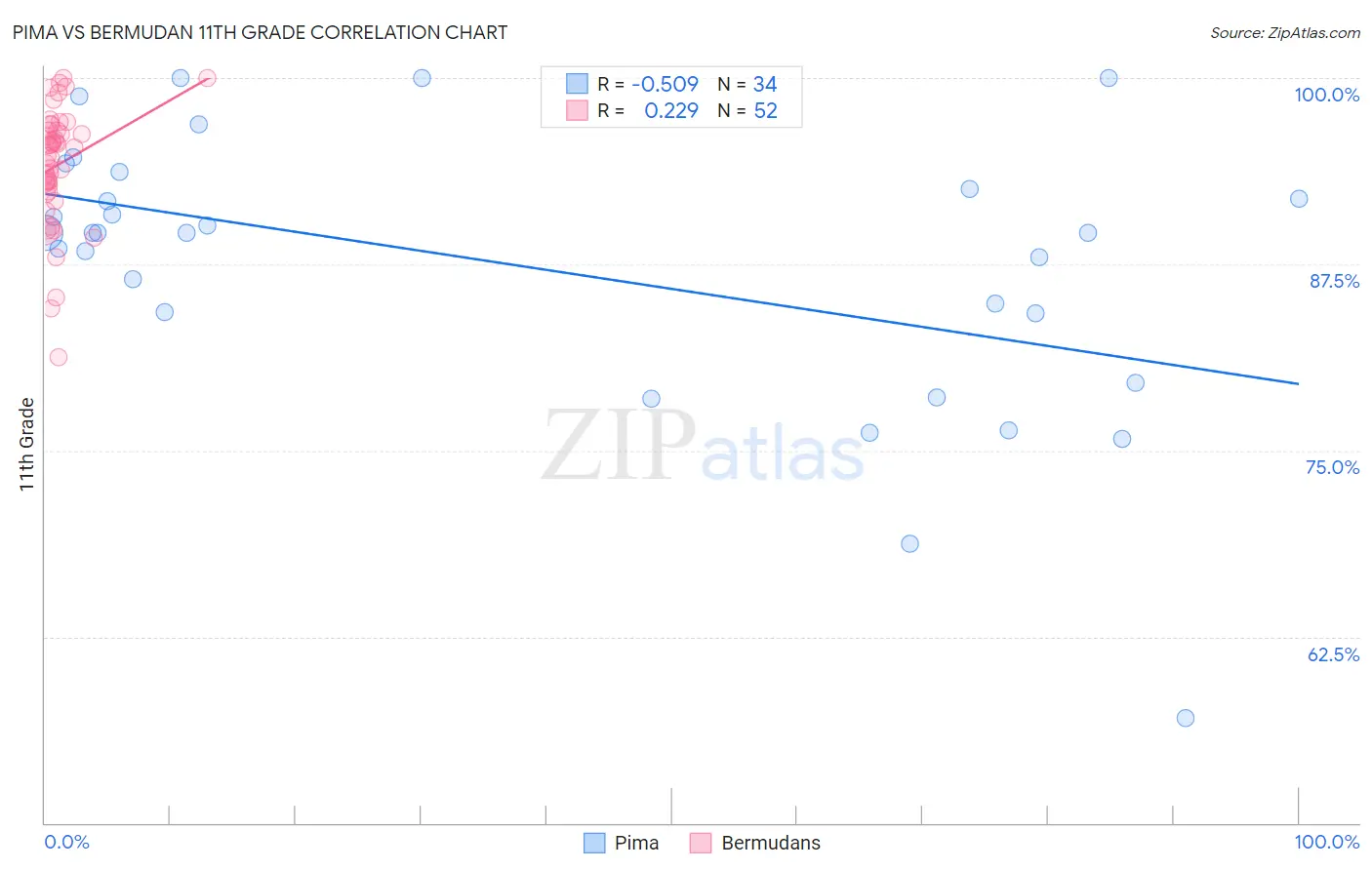 The statistical analysis conducted on geographies consisting of 61,552,942 people shows a substantial negative correlation between the proportion of Pima and percentage of population with at least 11th grade education in the United States with a correlation coefficient (R) of -0.509 and weighted average of 88.3%. Similarly, the statistical analysis conducted on geographies consisting of 55,730,379 people shows a weak positive correlation between the proportion of Bermudans and percentage of population with at least 11th grade education in the United States with a correlation coefficient (R) of 0.229 and weighted average of 92.6%, a difference of 4.9%.