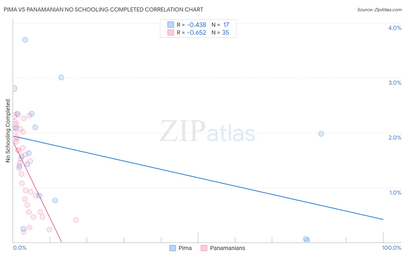 In terms of no schooling completed, the demographic groups most similar to Pima are Black/African American (2.1%, a difference of 0.020%), Mongolian (2.1%, a difference of 0.070%), French American Indian (2.1%, a difference of 0.12%), Immigrants from Taiwan (2.1%, a difference of 0.17%), and Portuguese (2.1%, a difference of 0.35%). Similarly, the demographic groups most similar to Panamanians are Arapaho (2.1%, a difference of 0.020%), Pakistani (2.1%, a difference of 0.060%), Immigrants from Kazakhstan (2.1%, a difference of 0.11%), Arab (2.1%, a difference of 0.17%), and Portuguese (2.1%, a difference of 0.17%).