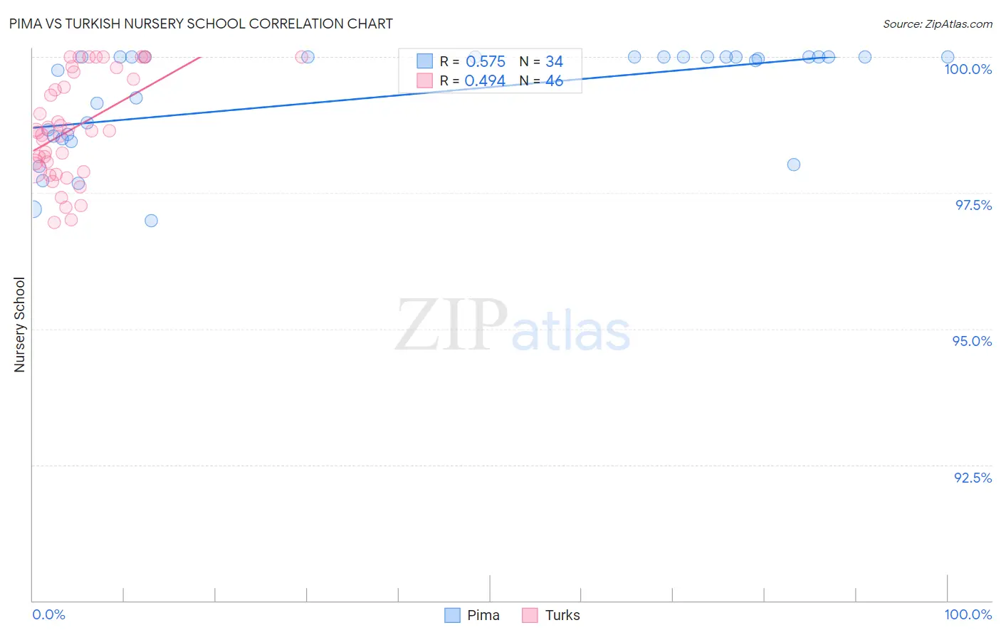 In terms of nursery school, the demographic groups most similar to Pima are German Russian (98.2%, a difference of 0.0%), Bhutanese (98.2%, a difference of 0.010%), Immigrants from Switzerland (98.2%, a difference of 0.010%), Basque (98.2%, a difference of 0.010%), and Immigrants from Singapore (98.2%, a difference of 0.010%). Similarly, the demographic groups most similar to Turks are Bhutanese (98.2%, a difference of 0.0%), Immigrants from Switzerland (98.2%, a difference of 0.0%), Basque (98.2%, a difference of 0.0%), Immigrants from Ireland (98.3%, a difference of 0.010%), and Cree (98.3%, a difference of 0.010%).