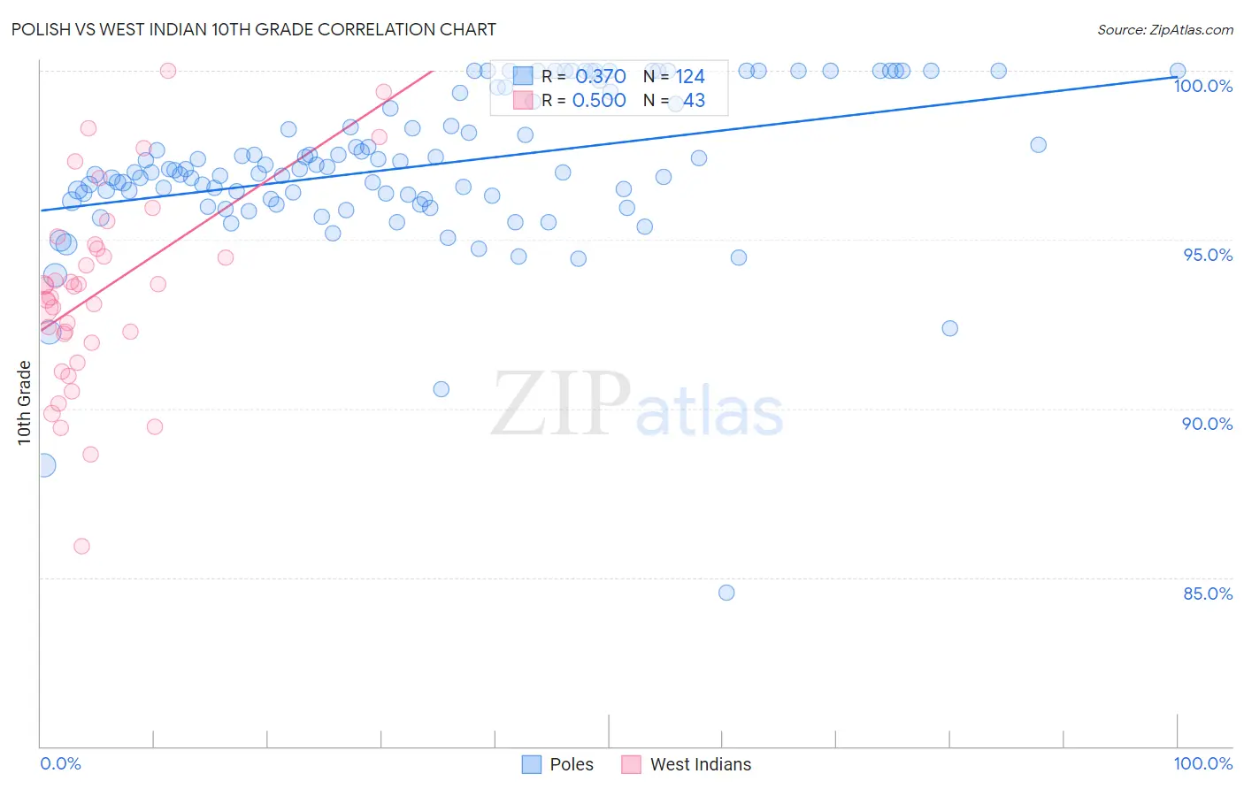 The statistical analysis conducted on geographies consisting of 560,594,575 people shows a mild positive correlation between the proportion of Poles and percentage of population with at least 10th grade education in the United States with a correlation coefficient (R) of 0.370 and weighted average of 95.8%. Similarly, the statistical analysis conducted on geographies consisting of 254,059,006 people shows a moderate positive correlation between the proportion of West Indians and percentage of population with at least 10th grade education in the United States with a correlation coefficient (R) of 0.500 and weighted average of 92.4%, a difference of 3.7%.
