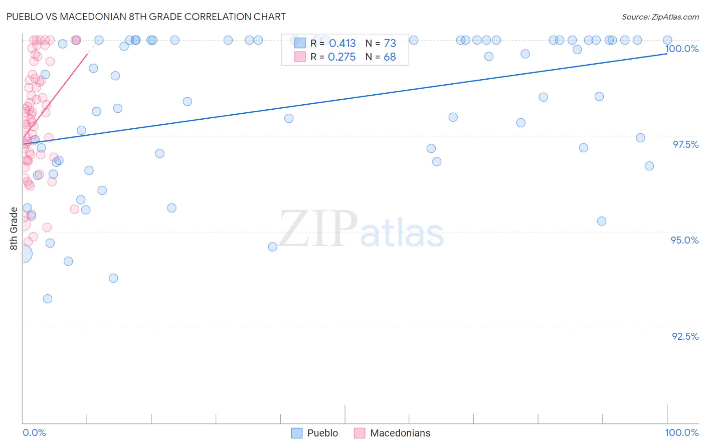 The statistical analysis conducted on geographies consisting of 120,086,078 people shows a moderate positive correlation between the proportion of Pueblo and percentage of population with at least 8th grade education in the United States with a correlation coefficient (R) of 0.413 and weighted average of 96.1%. Similarly, the statistical analysis conducted on geographies consisting of 132,592,860 people shows a weak positive correlation between the proportion of Macedonians and percentage of population with at least 8th grade education in the United States with a correlation coefficient (R) of 0.275 and weighted average of 96.7%, a difference of 0.64%.