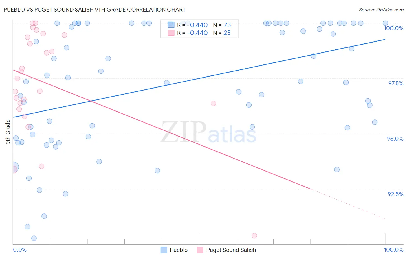 The statistical analysis conducted on geographies consisting of 120,086,078 people shows a moderate positive correlation between the proportion of Pueblo and percentage of population with at least 9th grade education in the United States with a correlation coefficient (R) of 0.440 and weighted average of 95.1%. Similarly, the statistical analysis conducted on geographies consisting of 46,155,775 people shows a moderate negative correlation between the proportion of Puget Sound Salish and percentage of population with at least 9th grade education in the United States with a correlation coefficient (R) of -0.440 and weighted average of 95.7%, a difference of 0.61%.