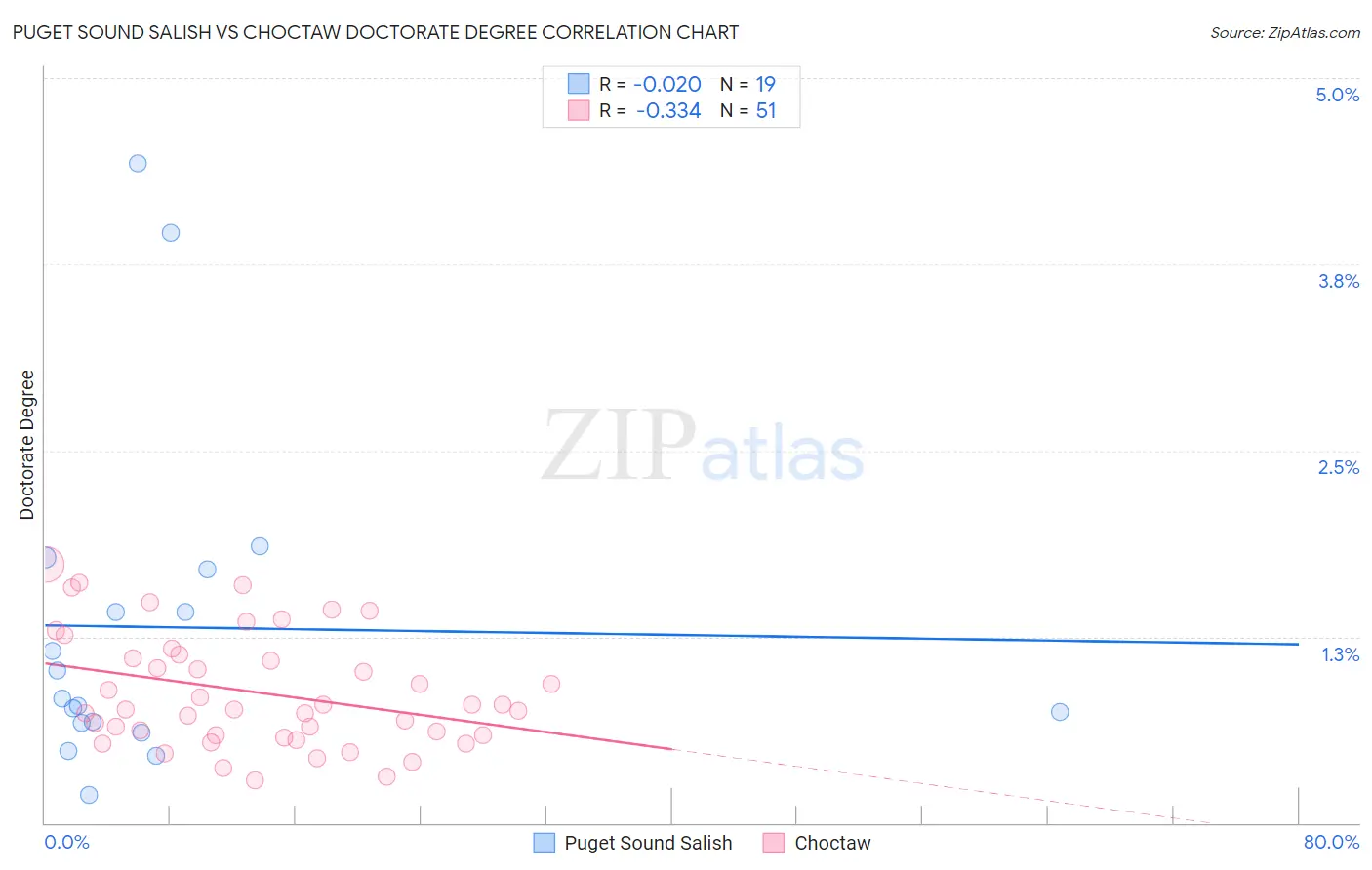 The statistical analysis conducted on geographies consisting of 45,861,164 people shows no correlation between the proportion of Puget Sound Salish and percentage of population with at least doctorate degree education in the United States with a correlation coefficient (R) of -0.020 and weighted average of 1.2%. Similarly, the statistical analysis conducted on geographies consisting of 265,489,053 people shows a mild negative correlation between the proportion of Choctaw and percentage of population with at least doctorate degree education in the United States with a correlation coefficient (R) of -0.334 and weighted average of 1.4%, a difference of 20.3%.