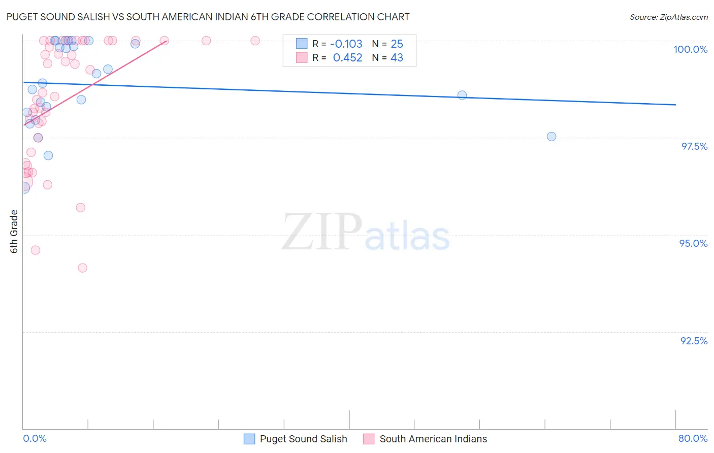 In terms of 6th grade, the demographic groups most similar to Puget Sound Salish are Immigrants from Belgium (97.5%, a difference of 0.0%), Immigrants from South Africa (97.5%, a difference of 0.0%), Immigrants from Australia (97.5%, a difference of 0.0%), Delaware (97.6%, a difference of 0.010%), and Pueblo (97.5%, a difference of 0.010%).