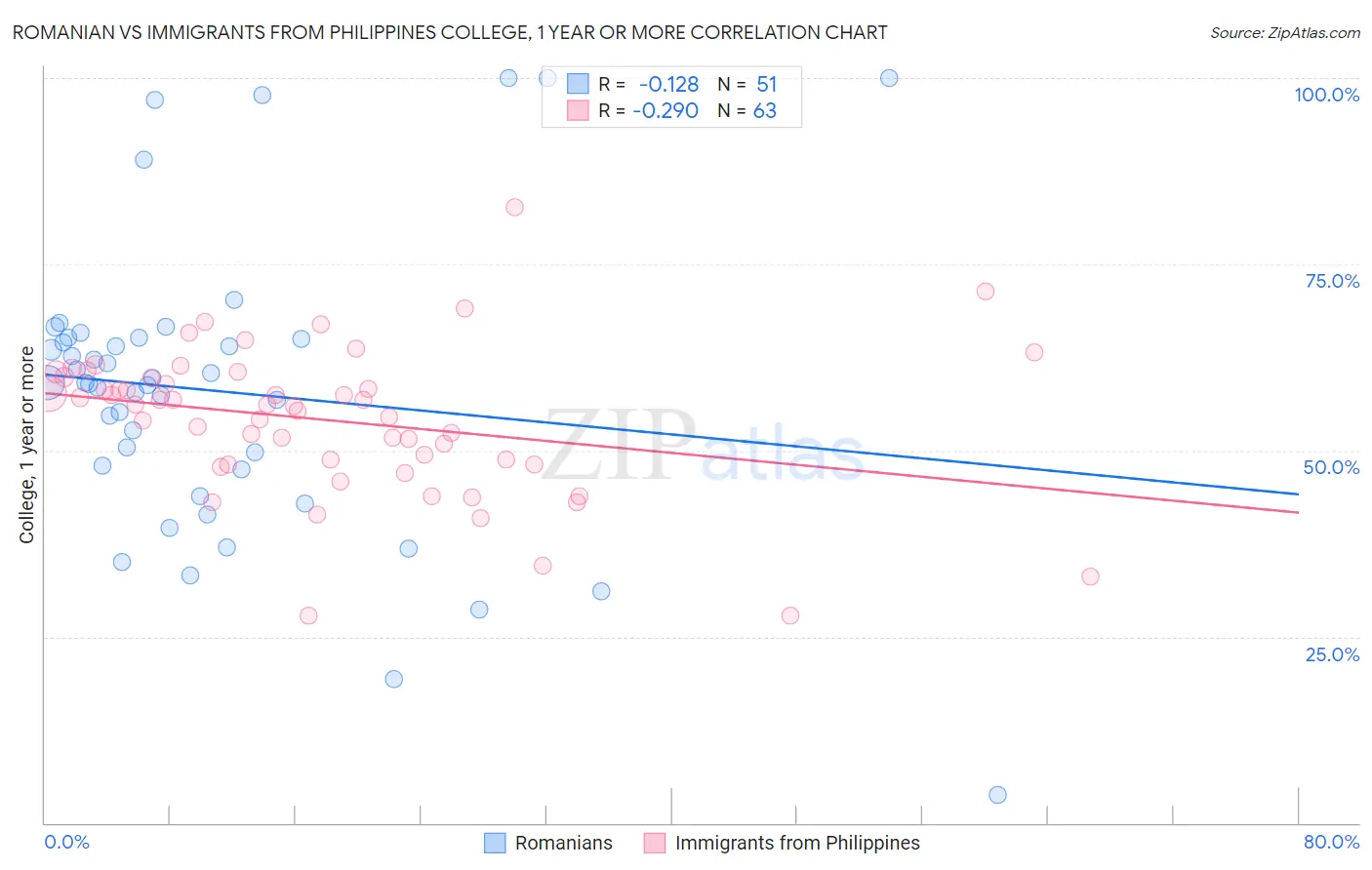 Romanian vs Immigrants from Philippines College, 1 year or more Correlation Chart