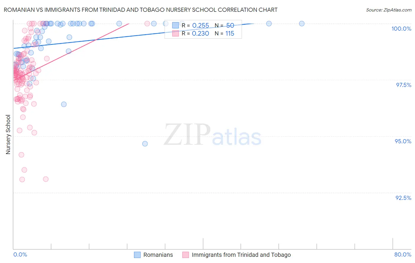 Romanian vs Immigrants from Trinidad and Tobago Nursery School Correlation Chart