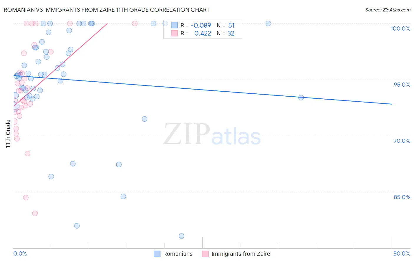 Romanian vs Immigrants from Zaire 11th Grade Correlation Chart