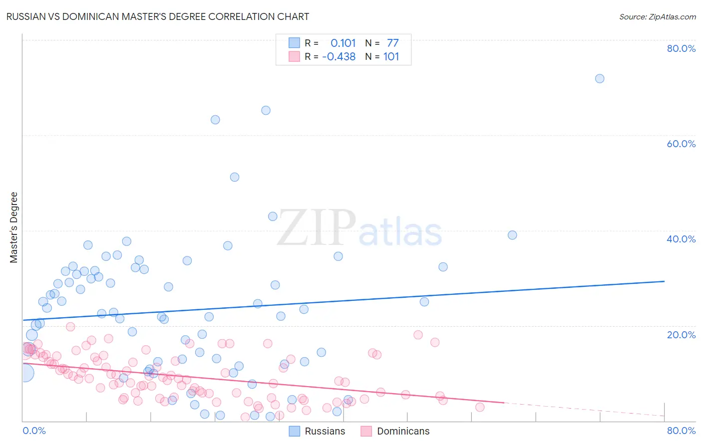 The statistical analysis conducted on geographies consisting of 511,948,246 people shows a poor positive correlation between the proportion of Russians and percentage of population with at least master's degree education in the United States with a correlation coefficient (R) of 0.101 and weighted average of 19.5%. Similarly, the statistical analysis conducted on geographies consisting of 354,930,218 people shows a moderate negative correlation between the proportion of Dominicans and percentage of population with at least master's degree education in the United States with a correlation coefficient (R) of -0.438 and weighted average of 12.5%, a difference of 56.5%.