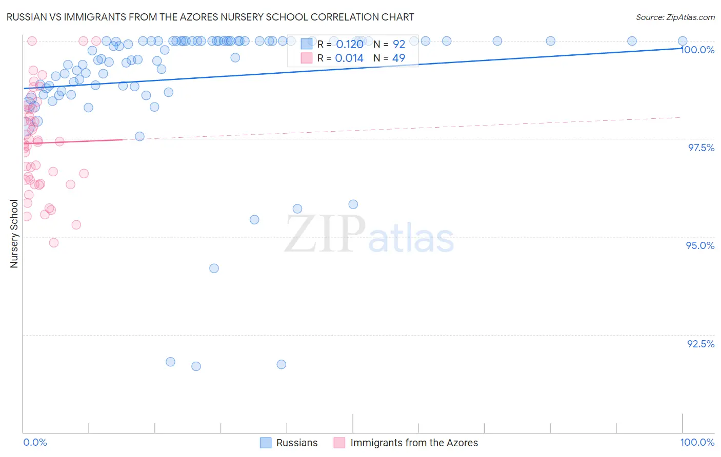 In terms of nursery school, the demographic groups most similar to Russians are Immigrants from Northern Europe (98.4%, a difference of 0.0%), Immigrants from Austria (98.4%, a difference of 0.0%), Cheyenne (98.4%, a difference of 0.0%), Serbian (98.4%, a difference of 0.0%), and Canadian (98.4%, a difference of 0.010%).