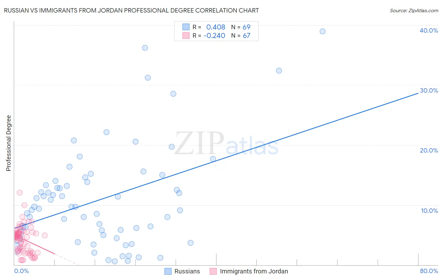Russian vs Immigrants from Jordan Professional Degree Correlation Chart