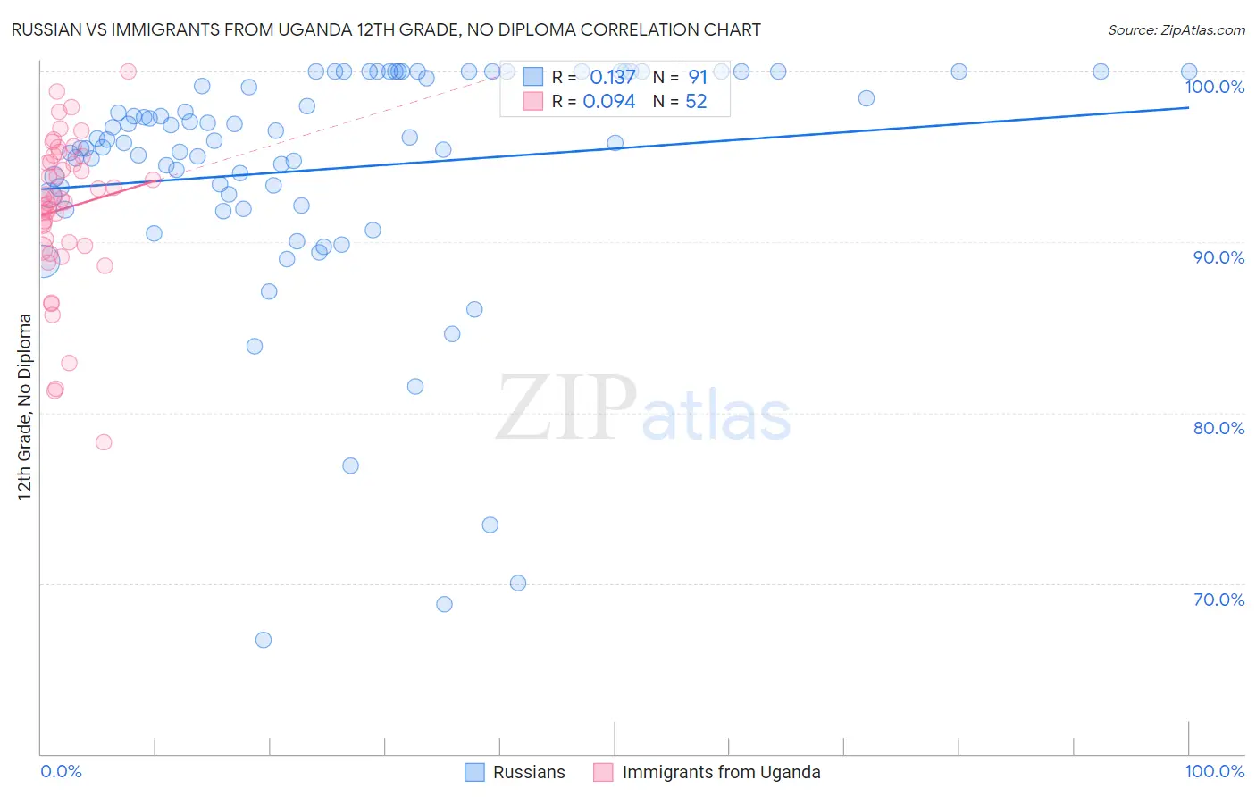 Russian vs Immigrants from Uganda 12th Grade, No Diploma Correlation Chart