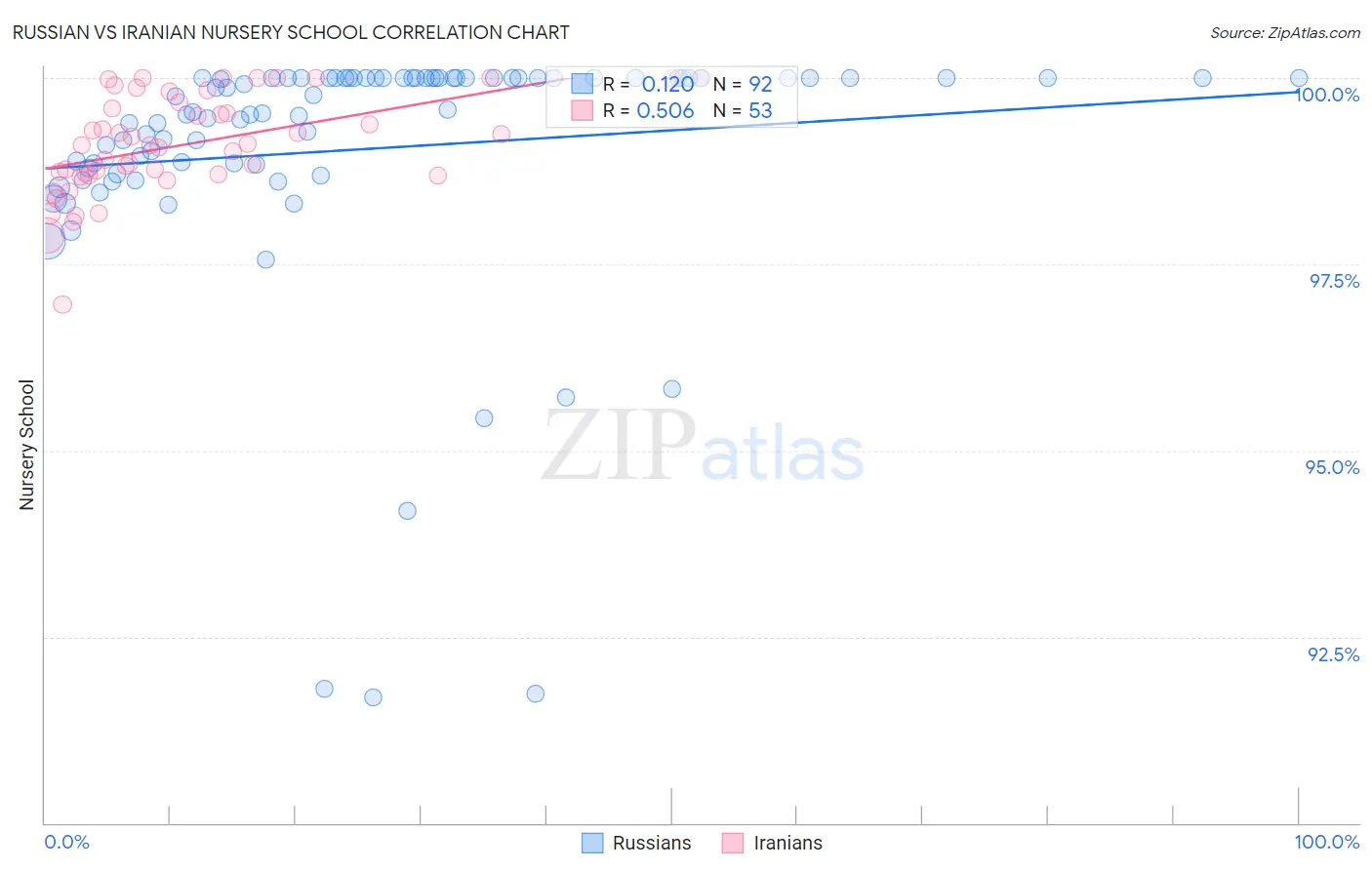 In terms of nursery school, the demographic groups most similar to Russians are Immigrants from Northern Europe (98.4%, a difference of 0.0%), Immigrants from Austria (98.4%, a difference of 0.0%), Cheyenne (98.4%, a difference of 0.0%), Serbian (98.4%, a difference of 0.0%), and Canadian (98.4%, a difference of 0.010%).