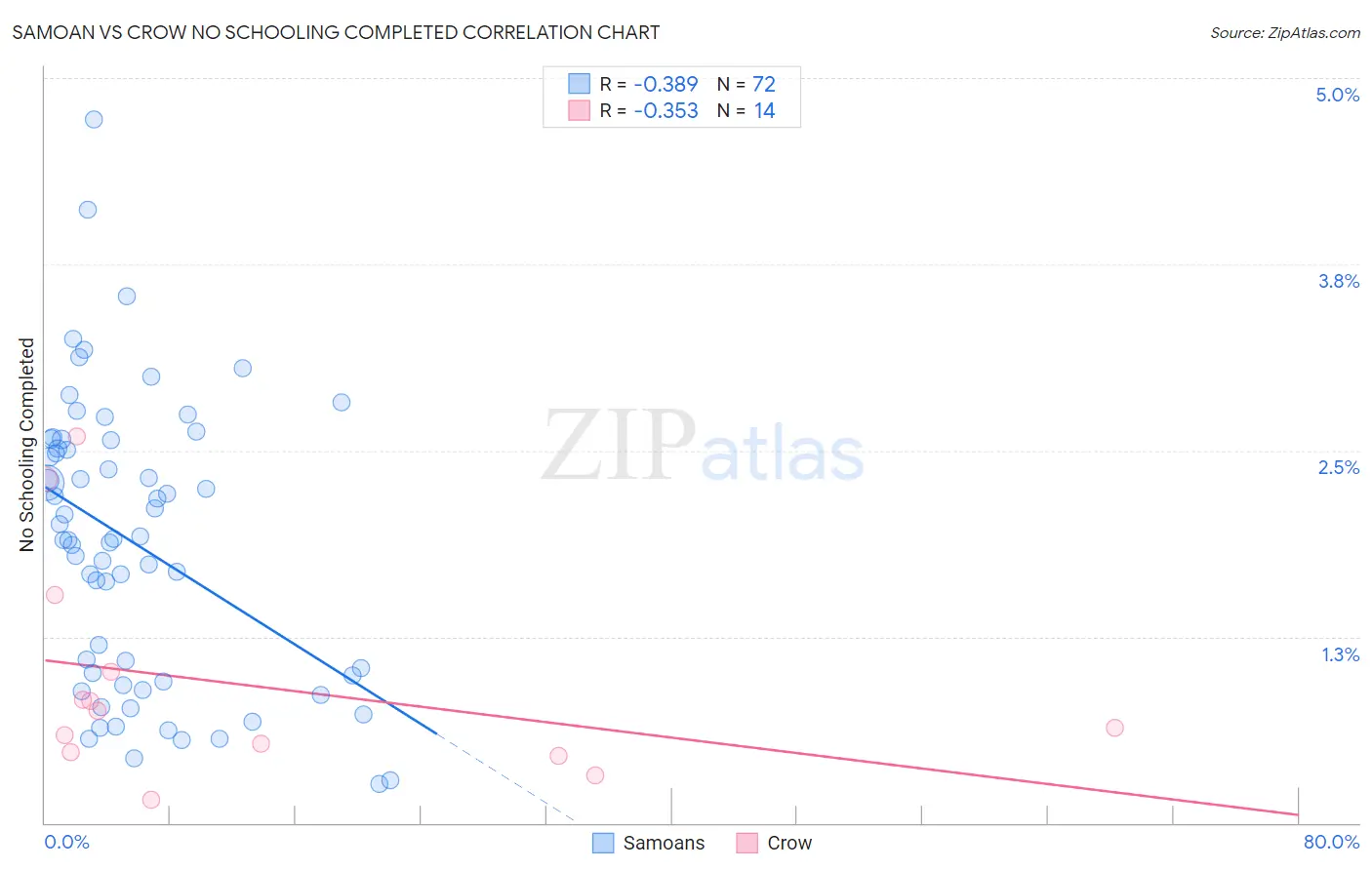 The statistical analysis conducted on geographies consisting of 223,861,902 people shows a mild negative correlation between the proportion of Samoans and percentage of population with no schooling in the United States with a correlation coefficient (R) of -0.389 and weighted average of 2.3%. Similarly, the statistical analysis conducted on geographies consisting of 58,922,127 people shows a mild negative correlation between the proportion of Crow and percentage of population with no schooling in the United States with a correlation coefficient (R) of -0.353 and weighted average of 1.6%, a difference of 37.9%.