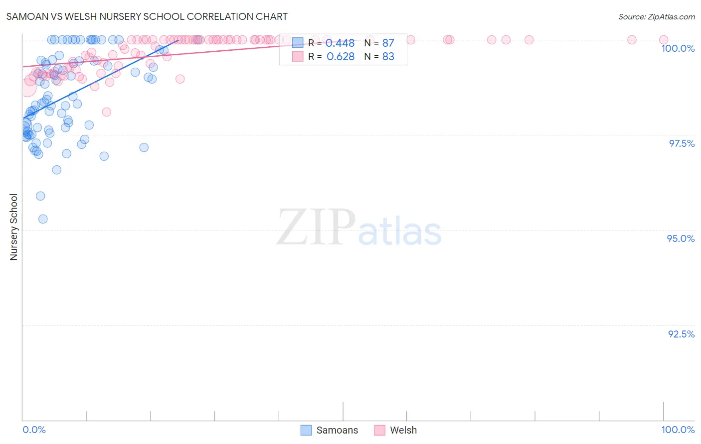 The statistical analysis conducted on geographies consisting of 225,201,431 people shows a moderate positive correlation between the proportion of Samoans and percentage of population with at least nursery school education in the United States with a correlation coefficient (R) of 0.448 and weighted average of 97.8%. Similarly, the statistical analysis conducted on geographies consisting of 239,962,401 people shows a significant positive correlation between the proportion of Welsh and percentage of population with at least nursery school education in the United States with a correlation coefficient (R) of 0.628 and weighted average of 98.9%, a difference of 1.1%.