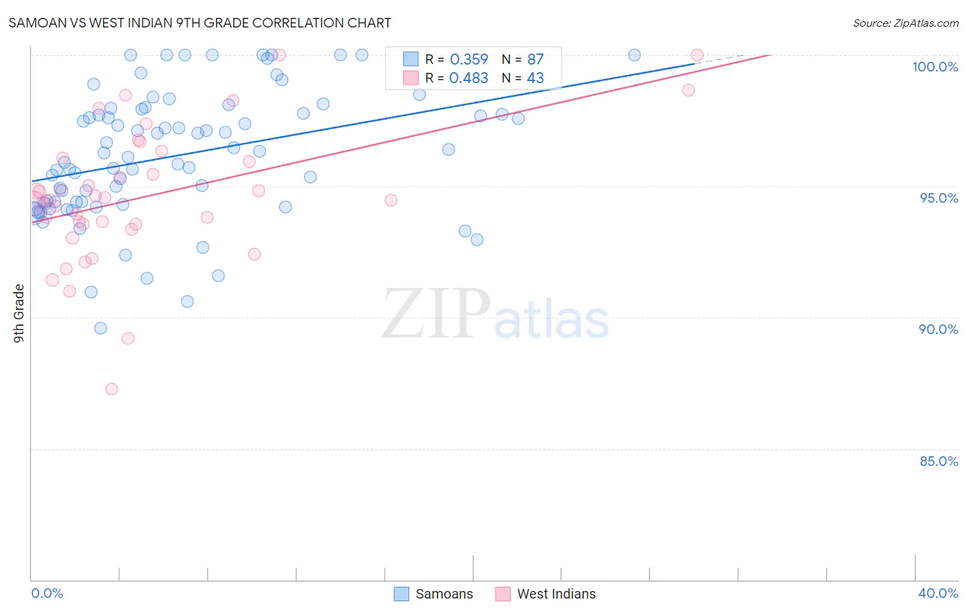 The statistical analysis conducted on geographies consisting of 225,201,909 people shows a mild positive correlation between the proportion of Samoans and percentage of population with at least 9th grade education in the United States with a correlation coefficient (R) of 0.359 and weighted average of 94.6%. Similarly, the statistical analysis conducted on geographies consisting of 254,059,006 people shows a moderate positive correlation between the proportion of West Indians and percentage of population with at least 9th grade education in the United States with a correlation coefficient (R) of 0.483 and weighted average of 93.7%, a difference of 0.91%.