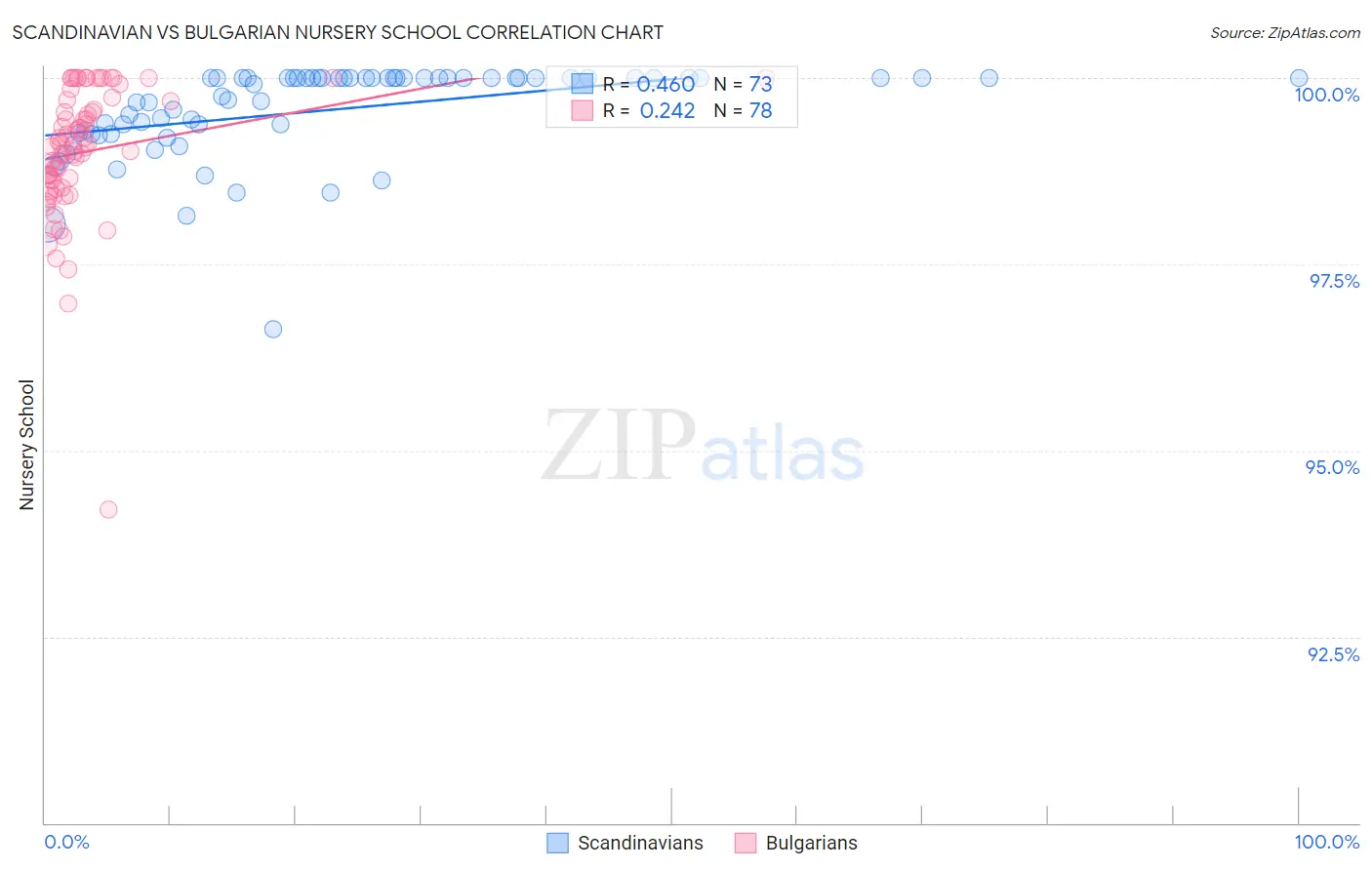 In terms of nursery school, the demographic groups most similar to Scandinavians are French (98.6%, a difference of 0.010%), European (98.6%, a difference of 0.010%), Czech (98.6%, a difference of 0.010%), French Canadian (98.6%, a difference of 0.010%), and Croatian (98.6%, a difference of 0.020%).