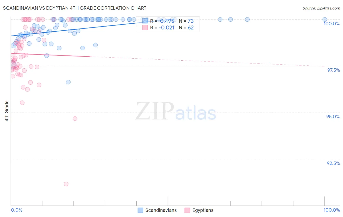 The statistical analysis conducted on geographies consisting of 472,660,430 people shows a moderate positive correlation between the proportion of Scandinavians and percentage of population with at least 4th grade education in the United States with a correlation coefficient (R) of 0.495 and weighted average of 98.3%. Similarly, the statistical analysis conducted on geographies consisting of 276,927,423 people shows no correlation between the proportion of Egyptians and percentage of population with at least 4th grade education in the United States with a correlation coefficient (R) of -0.021 and weighted average of 97.5%, a difference of 0.79%.