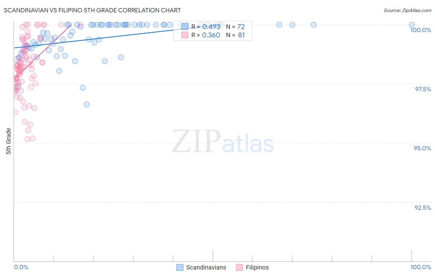 In terms of 5th grade, the demographic groups most similar to Scandinavians are French Canadian (98.2%, a difference of 0.0%), French (98.2%, a difference of 0.010%), Czech (98.2%, a difference of 0.010%), European (98.2%, a difference of 0.010%), and Yup'ik (98.2%, a difference of 0.020%).