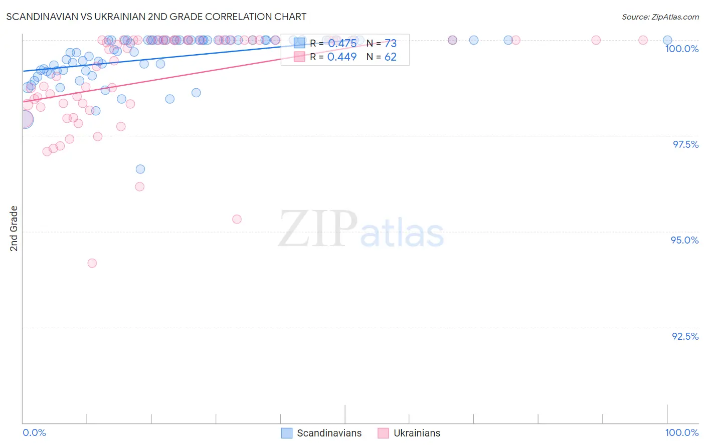 In terms of 2nd grade, the demographic groups most similar to Scandinavians are French Canadian (98.5%, a difference of 0.0%), French (98.5%, a difference of 0.010%), European (98.5%, a difference of 0.010%), Czech (98.5%, a difference of 0.010%), and Croatian (98.5%, a difference of 0.020%).