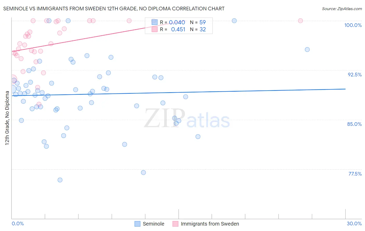 Seminole vs Immigrants from Sweden 12th Grade, No Diploma Correlation Chart
