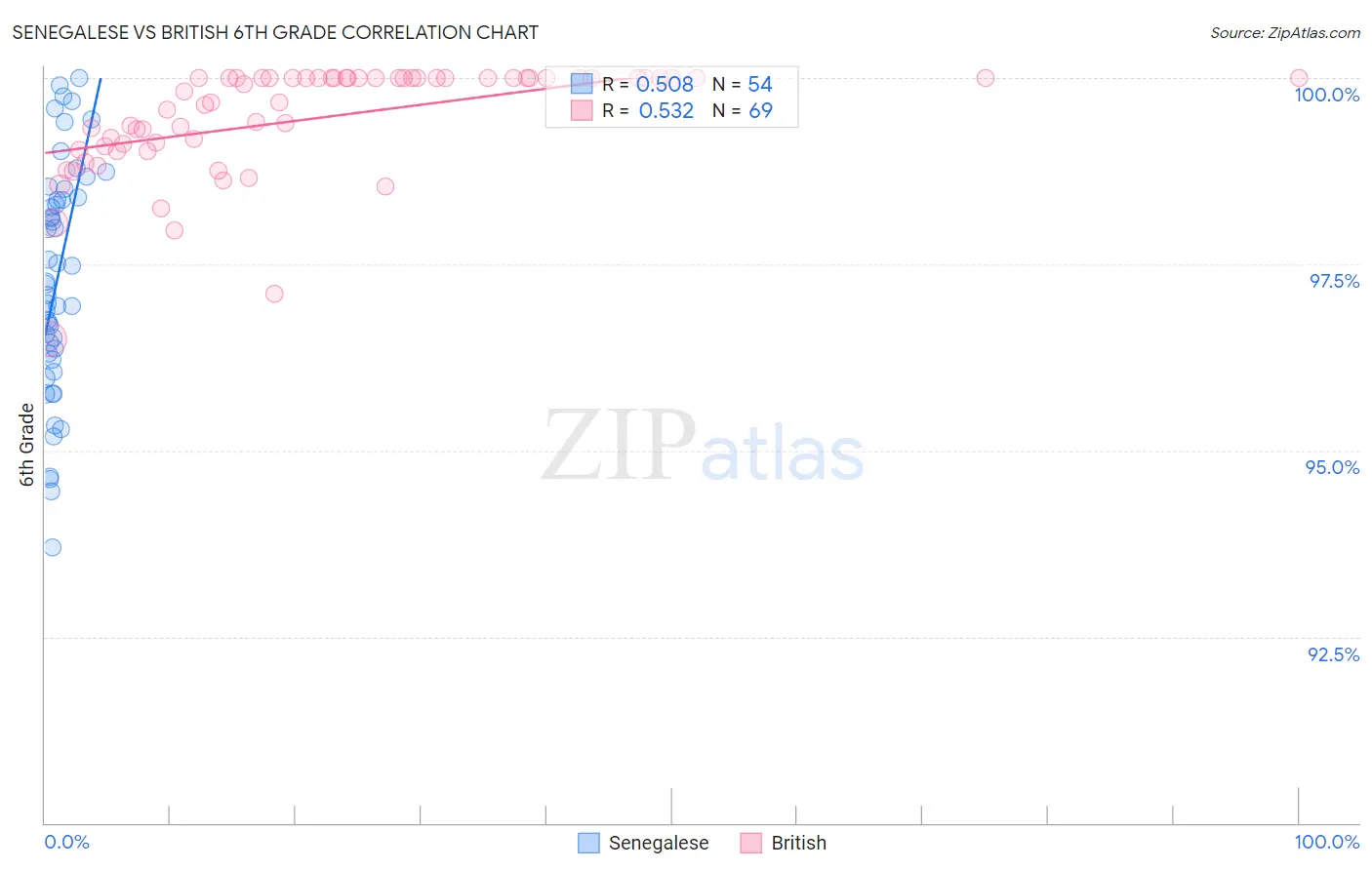 In terms of 6th grade, the demographic groups most similar to Senegalese are Nigerian (96.6%, a difference of 0.0%), Indian (Asian) (96.6%, a difference of 0.0%), Korean (96.6%, a difference of 0.0%), Immigrants from Asia (96.6%, a difference of 0.0%), and Immigrants from Eastern Africa (96.6%, a difference of 0.010%).