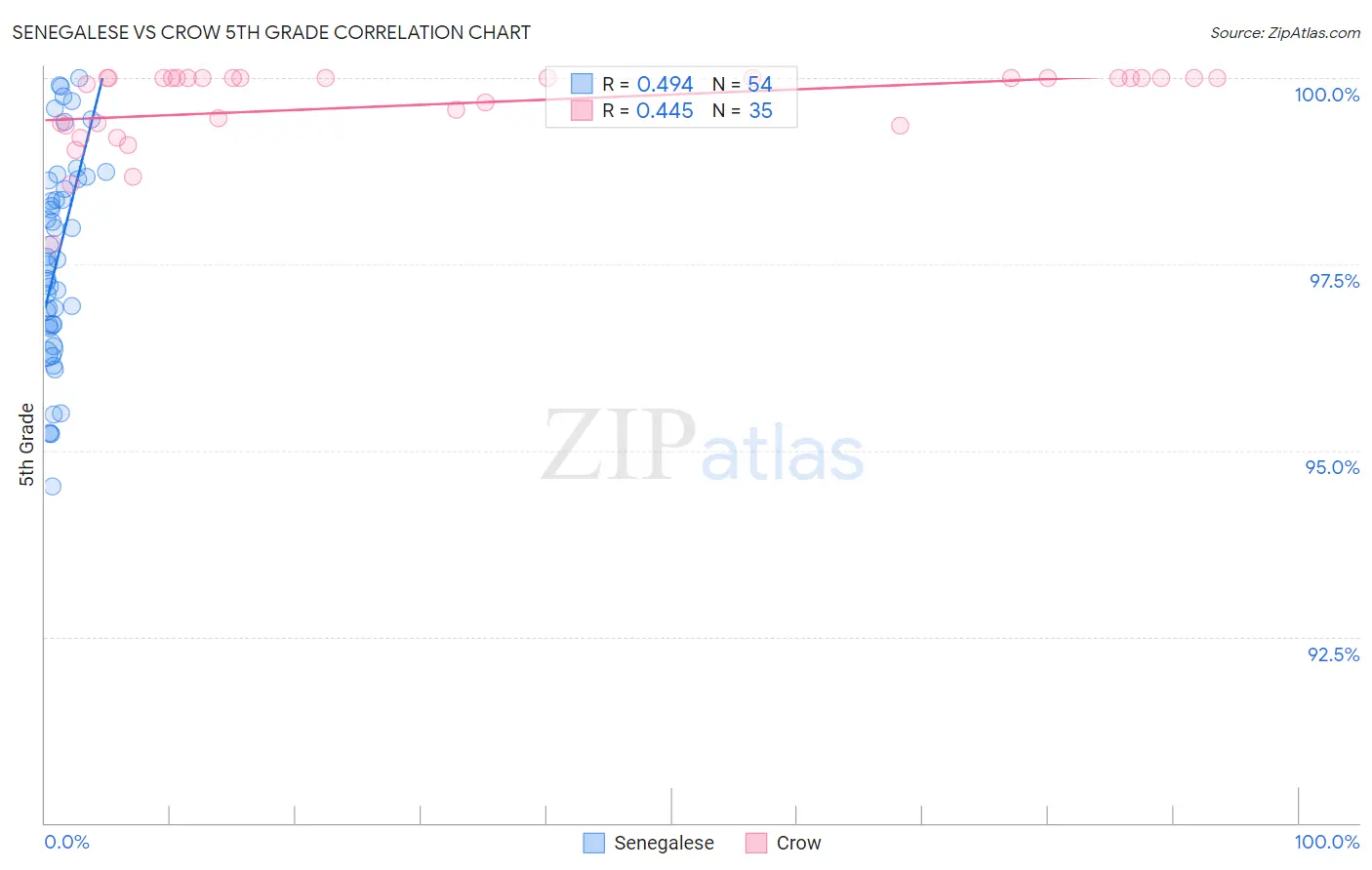 The statistical analysis conducted on geographies consisting of 78,142,569 people shows a moderate positive correlation between the proportion of Senegalese and percentage of population with at least 5th grade education in the United States with a correlation coefficient (R) of 0.494 and weighted average of 97.0%. Similarly, the statistical analysis conducted on geographies consisting of 665,246 people shows a moderate positive correlation between the proportion of Crow and percentage of population with at least 5th grade education in the United States with a correlation coefficient (R) of 0.445 and weighted average of 99.5%, a difference of 2.6%.